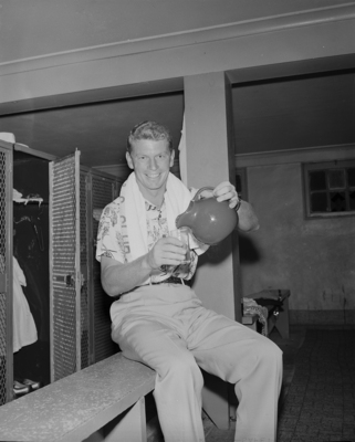 Bob French of Odessa, 23-year-old men's West Texas champion, relaxes after shooting a one-under-par 70 to capture medal honors in Glen Garden Invitation. Published in Fort Worth Star-Telegram, evening edition July 27, 1950.