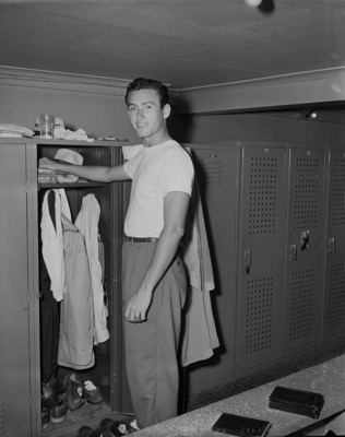 Fort Worth's Bobby Malone, in a dressing room, advanced at Glen Garden with 21-hole victory over Frank Wear Jr. of Paris. Published in Fort Worth Star-Telegram, evening edition July 29, 1950.