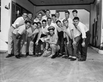 Image shows Staff Sergeant E. O. Hillard surrounded by a group of sixteen Poly High School athletes, who would report for duty with the Marines. Staff Sergeant kneels at the middle of the image. The boys, left to right, are (top) Jimmy Atkinson, David Nelson, James Galbraith, Bill Davis, Ray Hill, Wiley Phelps, and Roy Bostick; (bottom) Charles Sitton, Loyd Harper, Harold Reed, Billy Frick, Roy Willbanks, Curt Dearing, Percy Hill, Jerry Brewer, and David Tucker. Published in the evening edition, July 27, 1950.