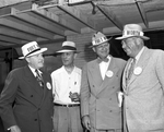 A party of Fort Worth business men are making a good will trip to West Texas sponsored by the Chamber of Commerce. Image shows four men left to right, J. Clyde Jones President of the Waples-Platter Company, Ray Loftis, Paducah, Martin Dies, Lufkin and Jim Floyd former Fort Worth resident with Lone Star Gas, Dallas. Ray Loftis, Paducah grocer, extended his hospitality when the Fort Worth trade trippers visited.