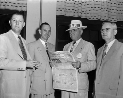 Image shows four men outside a store. From left to right, John W. Summers, Childress, Fay Eatherly, Childress, R.E. Cowan, Fort Worth and C.V. Jones, Childress. At right, Fort Worth Mayor Pro Team R.E. Cowan was a breakfast guest of John W. Summers, head of the Childress Board of City Development; Fay Eatherly, president of the Childress Chamber of Commerce, and C.V. Jones, Childress hardware merchant.