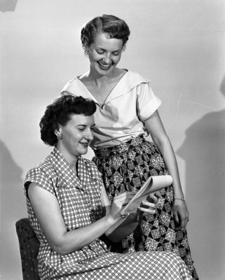 Image shows Miss Beverly Luckey, seated, and June Millican. They are planning the annual Young Womens Christian Association (YWCA) Commuters Camp, August 12-20 for business girls in Fort Worth. The camp is at Eagle Mountain Lake.