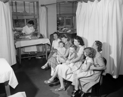 Image shows four children, four mothers and one nurse in a physio therapy room in a polio treatment facility at City County Hospital. Mothers wait for children needing post-polio treatment as Miss Barbara Kent works with child on table. The department head is Miss Jeanne Schenck.