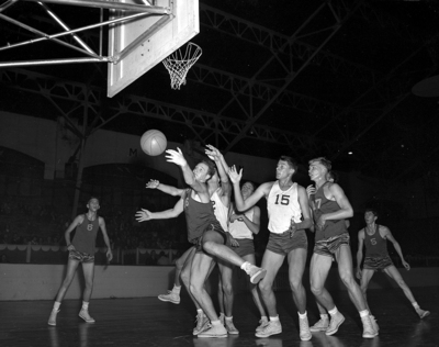Image show seven players of the Arlington Heights vs. Amon Carter Riverside basketball game. Kenneth Harlow (16) of Arlington Heights reaches to take rebound away from Carter Riverside's Eddie Chipman (12), Fred Whithers (5) and David Anderton (15) in City Conference game at North Side Coliseum. From left to right, unidentified (6),Kenneth Harlow (16), Eddie Chipman (12), unidentified), David Anderton (15), unidentified (17), and Fred Whithers (5)