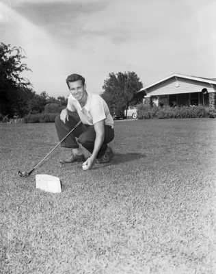 Bernard Riviere of Houston, 16-year-old son of Tink Riviere, once-famed Texas League pitcher, prepares for shot off the No. 1 tee. Published in Fort Worth Star-Telegram, morning edition July 28, 1950.