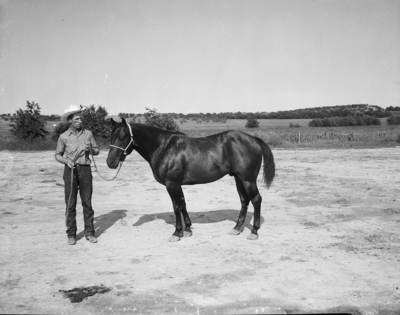 At the Parker County Frontier Days Quarter Horse Show at Weatherford, horse Poco Tivio, pictured with Pine Johnson, won as champion stud. Published in the morning edition, July 30, 1950.