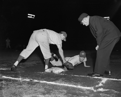 Image shows a baseball game between Fort Worth Cats and Beaumont. It shows Don Hoak, Cats, using his hand to beat Beaumont First baseman Joe Sabatella, from tagging . Beaumont won 3-2. Unidentified umpire is on right side. Published in the Fort Worth Star-Telegram evening edition, July 27, 1950.