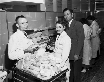 Image shows the packaging department for meats at a remodeled Safeway Store on 2816 Rosedale. Shown at work weighing and packaging bacon are, left to right, Willie Edward Anderson, head meat-cutter; Mrs. Ruth McCullough, and Willie F. Atherton, store manager. Published in the morning edition, July 30, 1950.