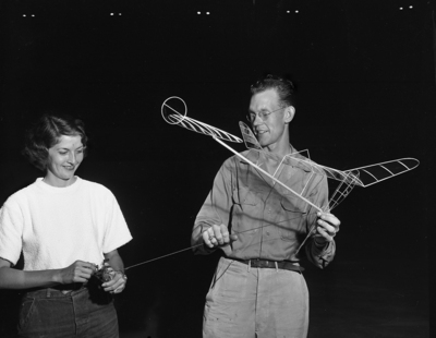 Mrs. Martha Dunham, (left), of Tulsa, is shown with her husband, R. J. Dunham, (right). Mrs. Dunham was the "chief winder" for her husband in the 19th National Model Airplane Contest held at Will Rodgers Memorial Coliseum. The rubber-band powered plane shown in Mr. Dunham's hand, weighed less than an ounce. Published in the evening edition, July 28, 1950.