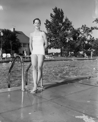 Visitor to Fort Worth, Susan Spice, a Texas Amateur Athletic Federation (TAAF) breaststroke titlist from San Antonio, is show relaxing at the River Crest swimming pool. Published in the morning edition, July 29, 1950.