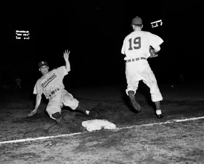 Image shows a baseball game between Fort Worth Cats and Beaumont. Beaumont's, Joe Sabatella is shown sliding into third base. He is forced on Rex Jones' sacrifice, Pitcher Clarence Podbielan to Don Hoak for first out in second inning. Beaumont won, 4-3. Published in the Fort Worth Star-Telegram morning edition, July 29, 1950.