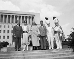 Uniformed bodies of the Moslah Temple, headed by three men, would take part in a downtown parade as a part of the Texas Shrine Association meeting to be held. Left to right, the image shows D. Frank Ellis, president, ceremonial directors; Ray H. Wyatt, patrol captain; Harry L. Laue, caliph, Bedouins; J. Oscar Webster, director, chanters; W. Sproesser Wynn, drum major, band; Arthur D. Ford, drum Major, drum and bugle corps. Published in the morning edition, July 31, 1950.