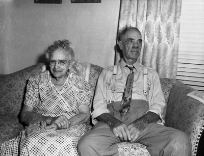 Julimus Belle Donnell and A. P. (Albert Pierce) Donnell, ages 82 and 83 at the time of this photo, are shown sitting side by side on a couch. The couple is one of many that attended the Cowboy Reunion held at Seymour. All of the couples in attendance at one point lived in Baylor county. In a contest held at the reunion for couples living in Baylor county whose combined age made the highest total, the Donnells were one half of the winning tie, with 165 years between them. Published in the morning edition, July 30, 1950.