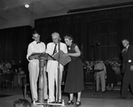 During a rump session of the Democratic party, Hamilton Rogers, (left), is shown standing next to Parliamentarian Ernest May (center), and Mrs. Margaret Carter, Jack Carter (right), as the three confer on a point of order. Rogers made the original motion for Anti-Truman Democrats that brought about a test vote. Published in the morning edition, July 30, 1950.