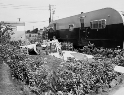 Mr. and Mrs. W. W. Gilbert won the blue ribbon and a cash award at Hacienda Trailer Park for the most beautiful lawn. The image shows Mr. Gilbert clipping the edge of the flower beds as his wife sits to near him. Published in the evening edition, August 2, 1950.