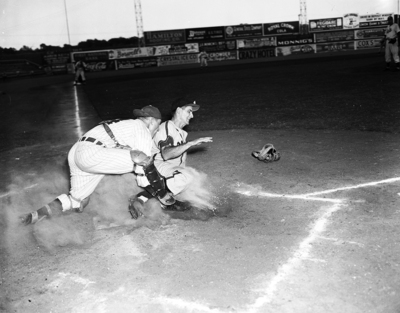 Image shows a game between Fort Worth and Shreveport. Pete Lewis is shown sliding home in fourth inning at La Grave Field. Ken Staples, right, is Cats catcher. Umpire Allen Andrews' ruling was that Lewis is safe drew arguments from Cats. Published in the Fort Worth Star-Telegram morning edition, July 31, 1950.
