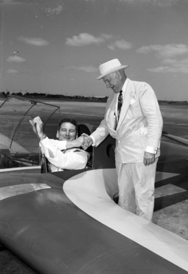 Amon Carter, right, shaking hands with Delos W. Rentzel while he sits in a plane.