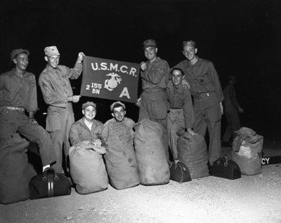 Seven Marines of Fort Worth's A Battery, 2nd 1mm. Howitzer Battalion (Reserve) are shown as they posed with their guidon before boarding a troop train at T&P Passenger Station headed for the Pacific Coast to join the 2nd air Division. Left to right, are Private First Class Morris Black, Sergeant Reginald Hedgpeth, Corporal J. T. Steele, Staff Sergeant William F. Florin, Corporal C. E. Steele, Private First Class Leslie V. Crow jr.., and Private J. T. Clay Jr. Published in the evening edition, August 1, 1950.