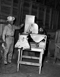 Cleo Grooms believes in giving his farm land the best of care and using good seed and equipment. He is shown here beside a seed treater. Published in Fort Worth Star-Telegram November 5, 1950.