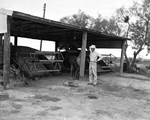 Image shows Cleo Grooms beside a building that stores farm equipment. He uses this equipment on his 1,500 acre farm in Brown County. Published in the Fort Worth Star-Telegram , November 5, 1950.