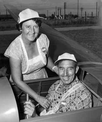 Mr. and Mrs. Walter J. Khrone, of Maitland Florida, were known to soaring enthusiasts as "Mom and Pop". Mr. Khrone, at 62, was considered the dean of seaplane pilots. The couple, who formerly lived in El Paso, are shown as they take part in the soaring meet held in Grand Prairie. Published in the morning edition, August 2, 1950.