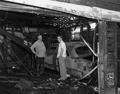 District Fire Chief E. M. Tunnell, is shown with John Allen Reeves as they survey the damage done after a fire at the Reeves' home at 212 Crestwood. Published in the evening edition, August 1, 1950.