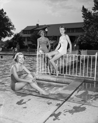 Image shows, left to right, Ann Robinett, Mimi Hill, and Anabel Shotts, spending their summer day at the pool. Published in the morning edition, August 6, 1950.