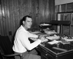 Image shows Luther McClung working on Aberdeen Angus registration papers at desk in office at the ranch in Tarrant County. Published in the Fort Worth Star-Telegram morning edition, September 3, 1950.