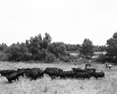 Image shows shot of Aberdeen Angus cattle in pasture on Luther McClung ranch near Fort Worth. McClung is the president of the Texas Aberdeen Angus Breeders Association. Three unidentified men right of cattle herd. Published in the Fort Worth Star-Telegram morning edition, September 3, 1950.