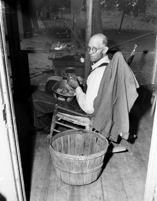Image shows Tom Little, handyman on the Doyle Sisters' farm, pealing peaches. He is seated in rocking chair with pipe. Published in the Fort Worth Star-Telegram morning edition, September 3, 1950.