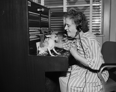 Inside the WBAP radio station, Mrs. Judy Meade brings her small two-year-old, one pound Chihuahua, Rosita, with her to work. The small dog usually sleeps in a box underneath the stations switchboard while her owner works. Rosita is considered the stations unofficial mascot by the employees. Published in the evening edition, August 3, 1950.