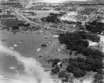 Image shows an aerial view of Wichita Falls after six-inch rolled through the southern part of the city, creating floods that forced the evacuation of homes. Near the center of the image, a flatbed truck can be seen, stalled by the high water. In some parts, the water was more than waist deep. The bottom left corner of the image is slightly obscured due to damage to the negative. Published in the morning edition, August 3, 1950. Photo taken from Ritchey Flying Service Plane.
