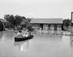 Image shows a home being evacuated by motorboat in Wichita Falls after six-inch rolled through the southern part of the city, causing Lake Wichita to pour its excess water into Holliday Creek, creating floods that forced evacuations. In the boat are Mrs. John Street, Mrs. Fred Street, and Mrs. J. C. Monroe of Duncan Oklahoma, who was visiting the streets, and J. H. Bancom. Published in the morning edition, August 3, 1950. Photo taken from Ritchey Flying Service Plane.