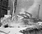 Image shows the result of a 3,100-pound iron weight smashing into the corner of a concrete building at West 7th and Taylor, seconds before the photo was taken. The building was reduced to a pile of rubble within minutes. Published in the morning edition, August 3, 1950.