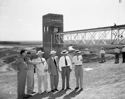 A group of men standing near the dam of Benbrook Lake include Amon Carter, John M. Fouts, William Holden, Joe B. Hogsett, and Fort Worth Mayor Frank Edgar Deen.