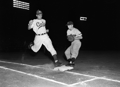 Image shows a game between Fort Worth and Dallas. Fred Storck, Cats, is shown running for first base. Dallas player, George Hausmann, tagged Storck out at La Grave Field. Published in the Fort Worth Star-Telegram morning edition, August 4, 1950.