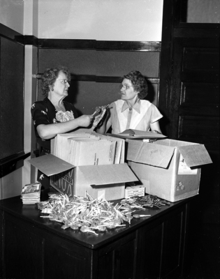 Misses Mamie Eppler, left, and Agnes Christenberry, are shown packaging kits of souvenirs to be given to delegates at the Delta Kappa Gamma convention in Dallas. Published in the evening edition, August 4, 1950.