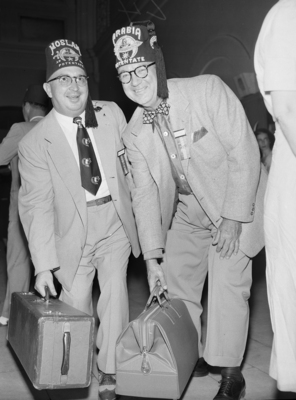 Potentate Marvin Mabry, left, of Moslah Temple, Fort Worth, greets Potentate P. L. Johnson of Arabia Temple, Houston, who arrived with about 800 nobles - the largest of four groups coming in for the Texas Shrine Association meeting.