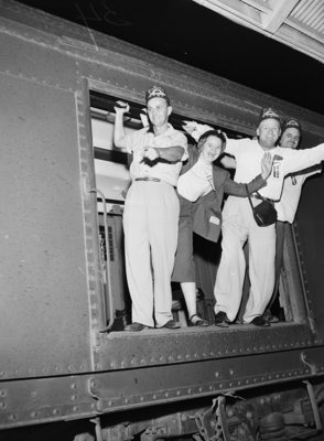 Pictured here are four persons from the Galveston delegation who waved from an open baggage car door as their special train rolled into Santa Fe Station.