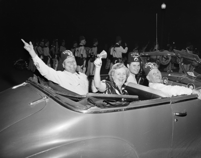 Mr. and Mrs. Dutch Englebert in the back seat and Pop Wood, all from Alzafar Temple at San Antonio, went for a ride with Moslah's C. R. Meals at the wheel in one of several dozen courtesy cars available to convention visitors.
