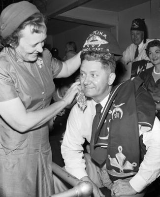 Mrs. Hugh Glezon is pictured here mopping her husband's perspiring face after he led his patrol from Galveston's El Mina Temple to third place.