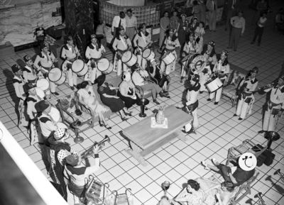 Of all the delegations at the convention, Amarillo's Khiva Temple was one of the most conspicuous. Their drum and bugle corps, here performing in the Westbrook Hotel lobby under the direction of Fred Rattan kept the Shriners aware that "Amarillo Wants You in 1951."