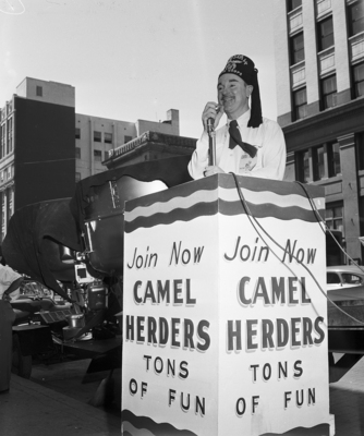 J. D. Garner of Fort Worth's Moslah Temple "barks" at 811 Houston where the "Camel Herders' Bar" was set up. A photographer "crashed" the door on a second attempt.