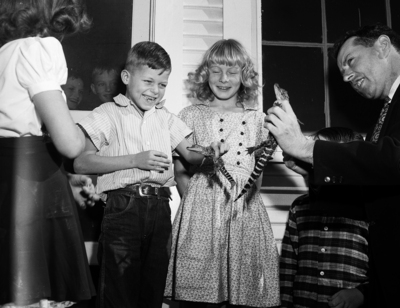 Carol Ann Price is amused but wary, so she lets Gerald McEntire hold Willie, a pet alligator. Willie and his pal, Junior, also shown in picture, are among the reptiles exhibited in Fort Worth schools by John Ripley Forbes, Fort Worth Children's Museum consultant. Forbes has addressed some 15000 students here.