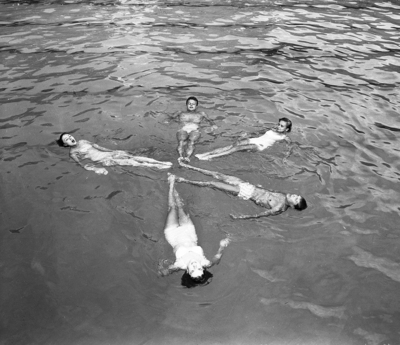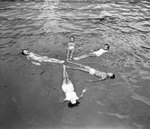 Image shows a water ballet performed by members of the Fort Worth Aquatic Club. The performance would be a featured number at the recreation department's Senior Health and Beauty Revue, held at the Forrest Park Pool. In star formation, shown clockwise from center front, are Betty Jo Hull, Connie Korg, Bob Weston, Helen Hartshorn, and Howard Parks. Published in the evening edition August 8, 1950.