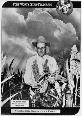 Image from the cover of the June edition of the Fort Worth Star-Telegram's Ranch and Farm News edition. Image shows a man wearing a cowboy hat standing in a field of wheat stalks. Published in October, 1951.