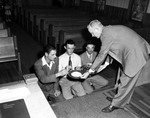 Shortly before these three brothers took communion at Wichita Avenue Methodist Church, they had all received orders to report for active duty with their Marine Air Reserve unit. Left to right are, Tech Sergeant Thomas R., Private First Class John L., and Private Harry C. Oxford. The young men are the sons of Mr. and Mrs. H. V. Oxford, of 311 South Henderson. Officiating to the right of the image, is their pastor, Reverend L. R. Vanderpoo. Published in the evening edition, August 7, 1950.