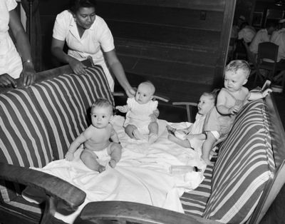 Image of four toddlers inside the children's area at the Star-Telegram Employees Association Picnic. One of the women hired to look after the children during the event can be seen to the left of the image. Published in August, 1950.