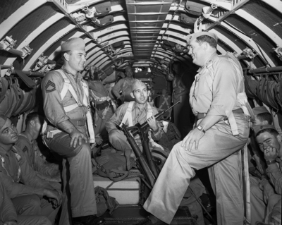 Captain John B. Long, right, a veteran with 15 years of service, is shown telling two other Fort Worth Marines- Tech Sergeant Larry Hill, left, of 2308 Ryan Place Drive, and Corporal H. D. Lawson of 3701 Nichols- "It won't be long now," as they boarded a transport plane at Grand Prairie Naval Air station bound for the West Coast. The Marines were the first reserve air unit to leave the Fort Worth-Dallas area since the start of the Korean war. Published in the evening edition, August 7, 1950.