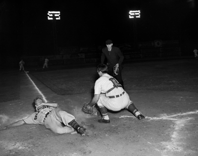 Image shows a baseball game between Fort Worth Cats and Indians. Stu Locklin, Indians, is shown sliding for home base to score. Right is Cat's Bobby Bragan trying to tag Locklin. Fort Worth failed to tag Locklin out. Cats won, 4-3. Published in the Fort Worth Star-Telegram evening edition, August 8, 1950.